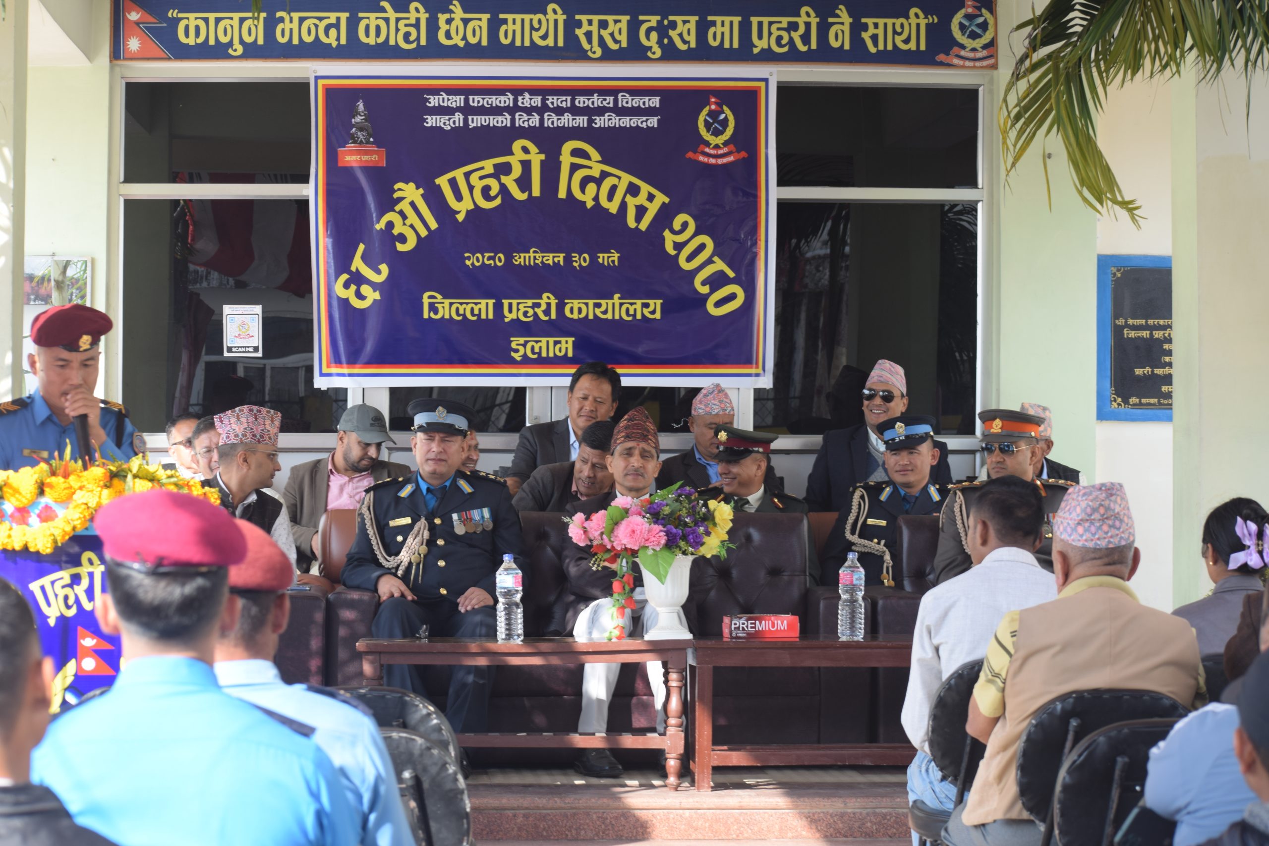 इलाम। जिल्ला प्रहरी कार्यालय इलामले ६८ औं प्रहरी दिवश एक समारोहका बिच कार्यक्रम सम्पन्न गरेको छ ।जिल्ला प्रहरी कार्यालय इलामका प्रमुख प्रहरी उपरीक्षक वासुदेव खतिवडाको अध्यक्षता तथा इलाम जिल्लाका निमित्त प्रमुख जिल्ला अधिकारी ध्रुव प्रसाद कोईरालाको प्रमुख आतिथ्यतामा भएको कार्यक्रममा स्थापित अमर प्रहरी स्मारकमा पुस्पगुच्छा चढाई बिर अमर प्रहरीहरु प्रति श्रद्धाञ्जली अर्पण गरीएको थियो । त्थस्तै प्रहरी कामकार्वाहीमा उत्कृष्ट भुमिका निर्वाह गरी आफुलाई सुम्पिएको पदीय जिम्मेवारी प्रसंशनीय तवरबाट कार्य सम्पादन गर्ने प्रहरी कर्मचारीहरुलाई पुस्कृत समेत गरीएको छ ।